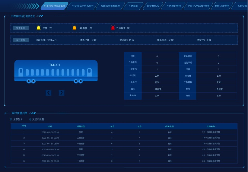 转向架动力学监测系统主要实现对车辆运行中的关键动力学性能以及关键部件的健康状态进行监测和跟踪的功能。通过采集车体、转向架和轴箱的横向、垂向振动加速度,能够对车辆平稳性、稳定性、安全性进行监测,以及对关键悬挂部件进行故障诊断。系统具备向车载主机发送车辆振动状态数据和诊断结果的功能,为地面数据分析系统提供车辆状态参数,进而支持地面智能运维系统通过车载监测系统提取特征和分析结果中提取车辆状态变化规律,支撑车辆状态修。车辆运行中动力学性能主要有稳定性、舒适性、安全性等几大方面,以及对车辆动力学性能密切相关的悬挂部件。该系统通过多物理量(冲击、振动、温度)感知,运用智能监控、网络化传输、专家系统、大数据处理等先进技术,对车辆走行部与轮轨提供全方位的安全监测、状态评估、故障预警、维修指导、健康管理服务与支持。